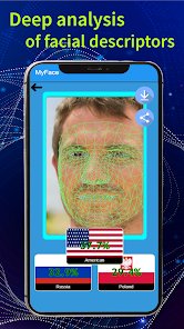 🌟📱 MyFace - Nationality by face is a fascinating app that utilizes advanced facial recognition technology to predict a person's nationality based on their facial features. Developed by DLMT DEV, the app stands out in the crowded market of facial analysis apps due to its unique purpose and user-friendly interface 🤖🖥️. With a sleek design coupled with intuitive navigation, users can easily upload their photos and receive predictions within seconds ⌛📷. The app's cutting-edge algorithms make it intriguing for users curious about the diversity reflected in their features 🌍💕. What truly sets MyFace apart from competitors is its swift processing, high accuracy, and a playful approach to bridging cultural curiosity 🤔🌏. By offering a unique blend of entertainment and curiosity-driven exploration, MyFace has managed to capture the attention of users worldwide. For anyone interested in discovering the multicultural elements lurking in their features, MyFace is a must-try app ➡️📲. Download now and uncover the nationality predictions your face holds! 🌐📥